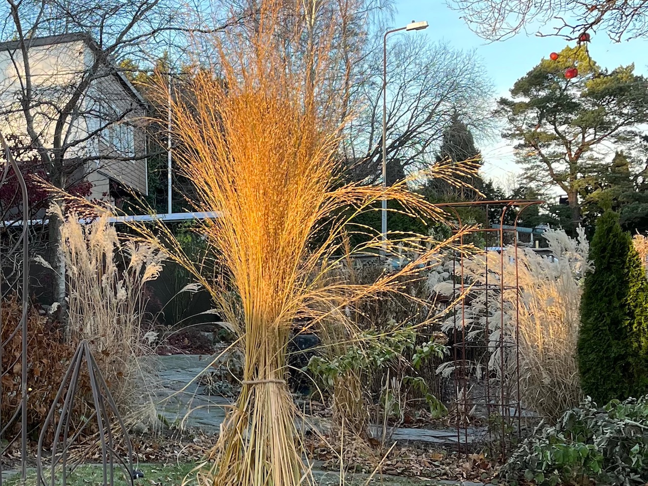 Två av mina favoritgräs, jättetåteln och diamantröret, har en tendens att knäckas under höstens tunga regn. Dem binder jag ihop med ett rep. Voilà! Nu står de upprätta och möter vintern som ”julkärvar”.