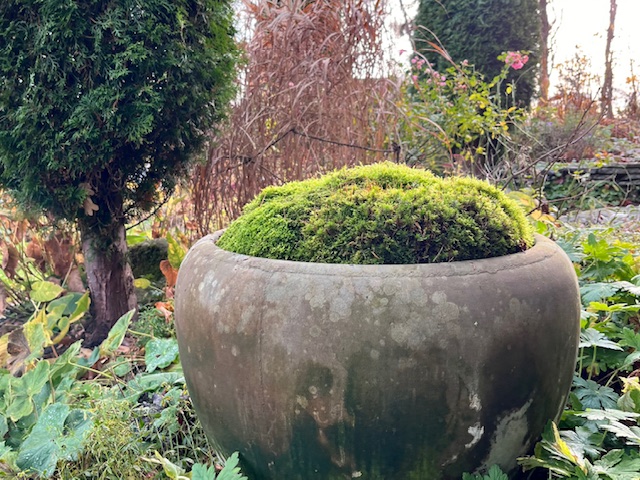 Frostsäkra krukor med fullt härdiga perenner, som till exempel funkia, kan stå ute året runt. Ge dem de ett skyddande och dekorativt moss-täcke till vintern, så kan det bli rabattens smycke.