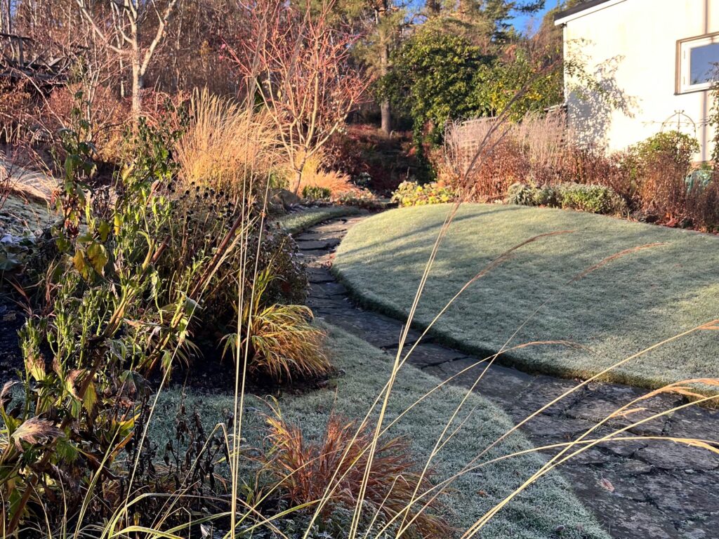 Mitt i vintern står persovskia, skymningsaster Twilight, kungsnäva Rosemoor och hakonegräs stabila i rabatterna. Sommarens blå färgskala har gått över till vitt, silver och brunt.